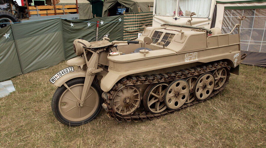Tahle zvláštní mašinka známá pod názvem Sonderkraftfahrzeug 2, nebo také Kettenkrad, vypádá na první pohled poněkud podezřele. Trochu připomíná německé pokusy o wunderwaffe, tedy o zázračnou zbraň. Fakt je, že je svojí koncepcí zcela unikátní, ale narozdíl od mnohých druhoválečných počinů vlastně docela dává smysl. Řízení, tedy alespoň jeho mechanická koncepce, je vlastně zmenšenina tanku s diferenciálem a brzdami jednotlivých housenic pro zatáčení. Na rozdíl od tanku se ale řídí motorkovými řídítky s mechanickým převodem pro páky brzd. Úplně vzadu je pak standardní motor z Opelu Olympia. Možná že vás napadne, že je to nějaký přepadový super-terénní motocykl, ale ve skutečnosti jde o lehký pásový tahač artilerie, který musel být zmenšen tak, aby se vešel na palubu letadla Ju-52, které se nakládá pěkně postaru přes rampu. Jedině tenhle malý Kettenkrad má rozměry, které mu dovolují letadlo plně naložit. Kvůli určení do letadla má i dvě palivové pumpy, jednu v přední části nádrže a druhou v zadní části. Díky tomu může využít i tu nejposlednější kapku benzínu při šplhání do prudké rampy. Později si i Němci uvědomili, že je to tak trochu moc složité a malých tančíků postavili jen něco kolem 7 500.