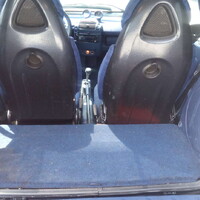 Výsledek je z fotografie jasný, do kulata je tu snad všechno, kapličky budíků, ovládání topení,dokonce i středové zrcátko je půlkulaté. Co mně jediné se uvnitř líbilo, tak byly sedačky. Sice jejich nastavování poloh bylo vcelku omezené, ale i přes to se v nich dost dobře sedělo. Z běžného provozu je sedadlo spolujezdce posunuté o kus dozadu, než řidičovo. Důvodem je prostor pro nohy, který je zkrácen díky úložnému prostoru pro autobaterii (mj. zde se i nachází VIN). S kufrem to není tak tragický, jak by si každý mohl myslet. Prostor jak v dodávce nikdo nemůže čekat, ale s trochou šikovnosti se toho tam dost vejde případně další prostor vznikne po složení spolujezdcovi sedačky do roviny.