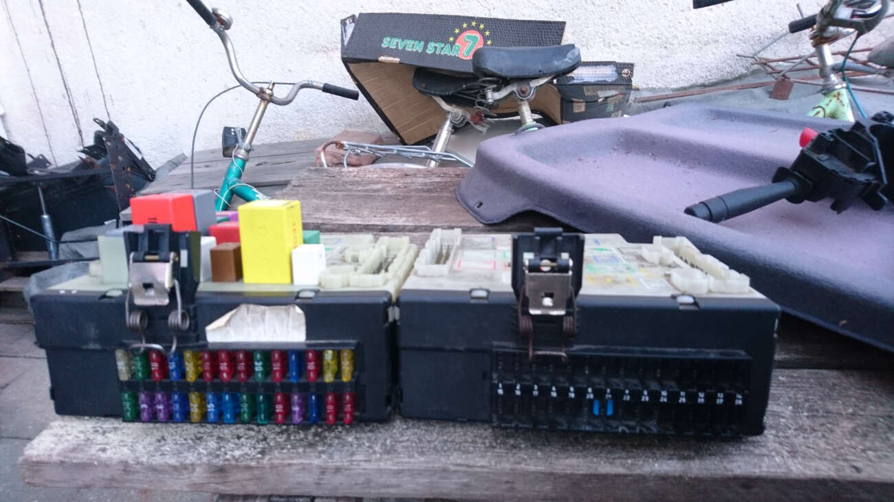 Doufám, že z videí je trochu jasný, jak to vypadá. Teď už tedy k elektrice. K autu je ještě jedna pojistkovnice. Aby to bylo náročnější, tak existuje několik typů pojistkovnic na tyhle Fordy. Na pohled jsou naprosto stejný, ale každá má výrobní kód – moje je: 91AG14A073BE. K autu mám tedy origo pojistkovnicu z roku 91 a druhou z roku 92, ale stejnej kód. S Origo 91 nefungují světla, blinkry, stěrače, ostřikovače a topení. Doufal jsem, že když zapojím pojistkovnicu z 92, bude aspoň nějaká změna. Bohužel, je to naprosto stejný. Ještě jsem si sehnal druhé páčky pod volant, protože ty se taky rády kazily. Ani tu jsem nepochodil. Rozhodl jsem se, že zkusím 92 pojistkovnicu rozdělat, ať vidím, co je špatně.