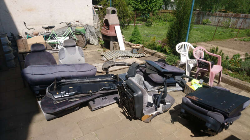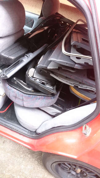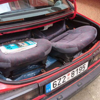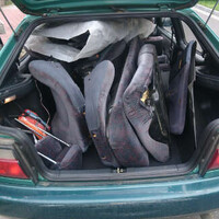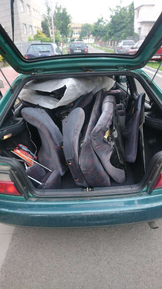 Rychlý telefonát – sedačky má, ale byly celou dobu hozený v Orionu a Orion už nemá okna. Otázkou zůstává, v jakém to je stavu. Stejně při nejbližší příležitosti jedu do Ostravy a sedačky vyzvedávám. Je léto a jak to leželo na slunku v tom vraku, tak kovová zadní část těch sedaček byla pěkně rozpálená, přihlížející slečna měla určitě super zážitek, když jsem to v mžiku pustil. K mému překvapení však sedačky vypadají velice dobře a krom natrhlého molitanu, nemají žádné vady. Jak to tak vypadá, celý interiér, co použiju, bude komplet z ostravského Oriona. Vzhledem ke stavu tohoto interiéru, bylo potřeba ho jen vyčistit. Vše jsem úhledně pomocí Tetris metody naložil do své Corolly (včetně toho plesnivého koberce) a jel ke kamarádovi s tepovačem. Jedno odpoledne práce a mám čisto.