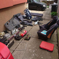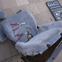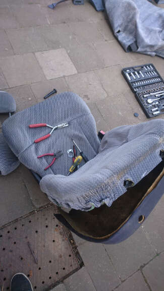 Narazil jsem ještě u sedáku. Ten je podpírán takovou mřížkou, která je natažena čtyřma žlutýma pružinkama. Zkoušel jsem všemožně ty pružinky umístit a natáhnout, ale jediná funkční metoda byla sikovkama. Pevně držet, nepustit a natahovat. Nespočet pokusů na každou pružinku a spousta nadávání. Se sedačkou jsem se trápil přes půl hodiny. Po víc jak hodině úmorné práce byly pružinky na místě v obou sedačkách. Složení zbytku a nasazení koleček pro sklápění už byla sranda, ikdyž jsem byl značně vysílenej. Tímto anabáze se sedačkama končí, jsou zabalený v igelitu a jen čekají, až je budu moct namontovat do auta. Zbytek šedého interiéru se může vyhodit, ten je nepoužitelný a kompletní interiér ze Slovenska zkusím udat na Escort klubu.