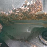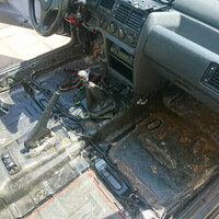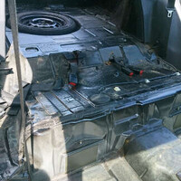 Celkem paradoxně jsem se pustil do práce na sedačkách a interiéru (no, jako když člověk doma skladuje 3 interiéry, je asi pochopitelné, že jsem se chtěl zbavit přebytečných částí, protože autodíly máme doma už VŠUDE). Povyndával jsem zbytky původního šedého interiéru z Oriona, aby to auto bylo co nejvíc prázdný. Protože v něm potřebuju uskladnit modrej slovenskej interiér a ten šedivej. To taky znamenalo, že když jsem chtěl v autě něco dělat, musel jsem pokaždé vše vyskládat. Během tohoto procesu jsem ovšem objevil další rez a zdroj vlhkosti v interiéru. Pod baterkou totálně prorezlá díra. Tohle byla typická bolest Escortů/Orionů té doby a samozřejmě se to nevyhlo ani mému kusu.
