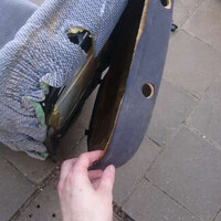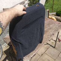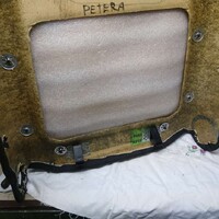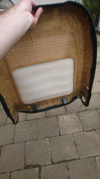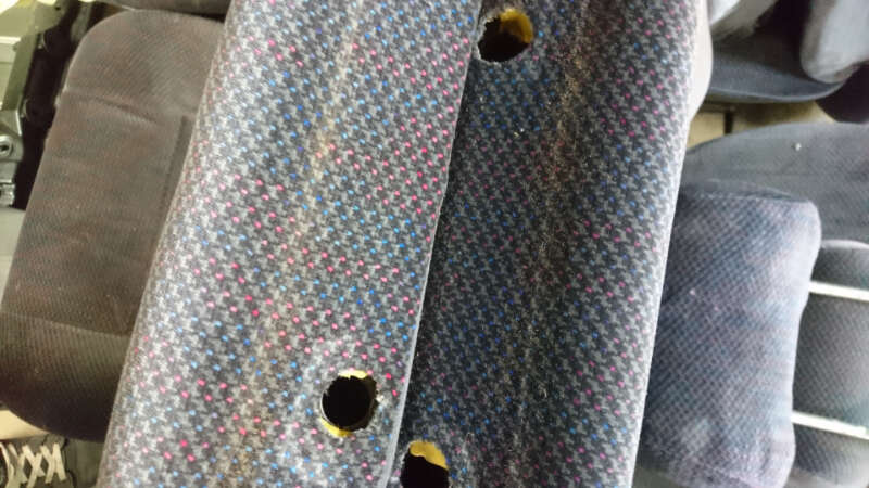 Nejdřív jsem si však destruktivně rozebral původní šedé sedačky, abych věděl, co tam je jak upevněný. Vypadl z podsedačky divný zelený papírek – jak jsem později zjistil, byl to papírek od kontroly kvality. Hezkej artefakt. Největší horor pochopitelně byl s tím zadním dílem, kde je ještě integrovaná odkládací síťka na drobnosti. Síťka je prověšená a já ji chci také opravit. Záslepky se mi nepodařilo zachránit, plast časem zkřehnul a rozpadly se na milion kousků. Nevadí, snad se dají podobné koupit v autodílech. Látka šla dolů opravdu lehce, jelikož lepidlo se už jen drolilo. Stačilo vyklepat a po lepidle nebylo ani známky. Sehnal jsem si čalounické lepidlo a jal se k lepení té látky na karton. Ve výrobě se to asi nějak lisuje a já si věřil, že to prostě přesně trefím, a ještě i správně na všecky výřezy. Tenhle nápad byl odsouzený k neúspěchu už od začátku a taky to tak dopadlo.