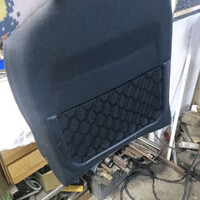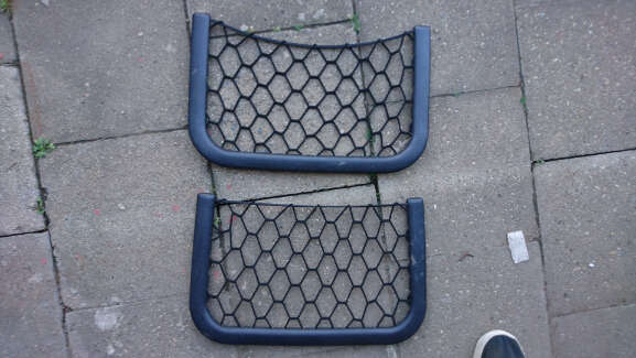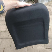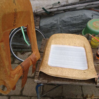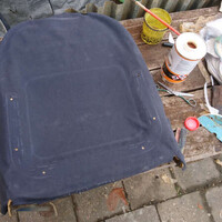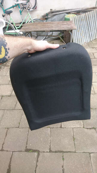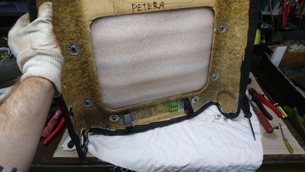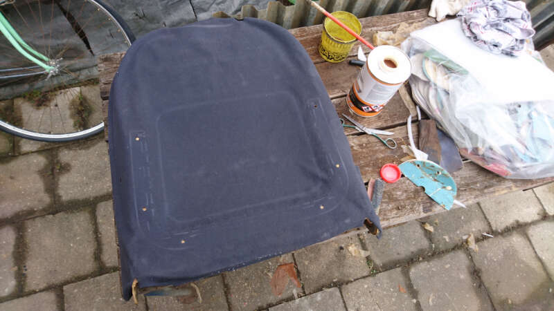 V půlce lepení už látka neseděla a nešlo reálně postupovat dál. To bylo nervů a stejně zbytečně. Potupně jsem navštívil svého čalouníka a ten mi to za 1000 kč/ks krásně přečalounil novou látkou, protože tou starou by bylo nemožný to udělat. Opravu úložné síťky jsem už naštěstí zvládnul – stačilo zastřihnout volnou gumičku a znova ji tam zaplést. Záslepky jsem koupil nové, v černé barvě, aby to sedělo k látce. Dále bylo potřeba opravit zadní opěradlo. Krycí plech byl orezlý, tudíž vybrousit, odrezit a nastříkat sprejem. Rád si potrpím i na takové detaily.