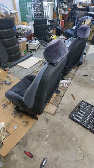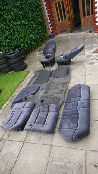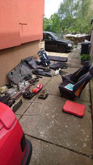 Původní šedej interiér z Oriona je zničenej a nevyužiju z něj téměř nic, maximálně něco na pokusy, ať si nezničím ten hezkej, co přijde do auta. Dveřní tapecírunk jsem se rozhodl použit ostravskej, jelikož není vytahanej, oproti temu slovenskýmu. Přední sedačky jsem chtěl použít taky ostravský, protože jsou míň prosezený. Zadní sedačky jsem měl nachystaný slovenský, jelikož mají hlavové opěrky a vypadají dobře.