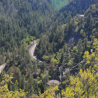 Volant začneme pořádně používat až v momentě, kdy asi po dvaceti minutách mineme odbočku na vyhlídku na Oak Creek Canyon. Výhled je to pěkný, což o to, ale indiáni vnucující svě "šperky" umí být pěkně otravní. Vyhlídku proto elegantně přeskočíme a pokračujem k bodu, kde se cesta pěkně zakroutí. Následují asi dva kilometry zatáček. Cesta se pěkně zařezává do stěny kaňonu a padá o téměř 500 výškových metrů. Rozhodně stojí za to to dole otočit a dát si to i nahoru. Je to větší sranda.