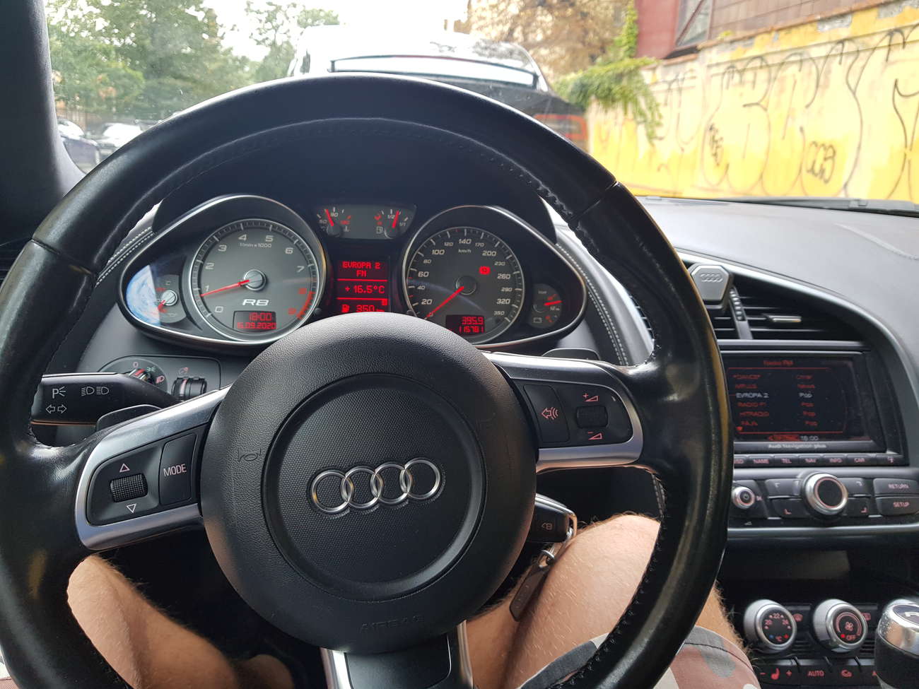 Nájezd 116 tisíc kilometrů pro lecjakou Audinu znamená tak maximálně to, že je čerstvě zajetá, ale na ostrej sporťák je to fakt hodně, speciálně když se v něm za volantem střídá jeden vocas za druhým (počítám tam i sebe), pač pronájem není moc drahej a majitel se snaží alespoň “neprodělat moc”. Takže zde pořádně nefungovalo odemykání dveří na dálku, lak byl místy poničenej, dveře u řidiče rozhodně viděly lepší časy, nefungovala klimatizace, brzdy pískaly, dokonce jsem musel dolejvat olej :D Byl tam schválně nastavenej omezovač otáček na 6500 (místo tradičních 8000), bohužel ne příliš chytře tak, aby si to rozumělo s automatickým řazením. Takže když jsem zarazil plynovej pedál do podlahy, aby R-tronic věděl, že má řadit úplně nahoře, tak to dřív narazilo na ten omezovač a já v zápětí působil jako pubescentní výrostek v autoškole … bohužel jsem to poprvé zjistil uprostřed přejížděcího manévru, takže jsem byl nadšením bez sebe. Řešením je v tu chvíli lehce zvolnit na plynu anebo explicitně přeřadit pádlem.