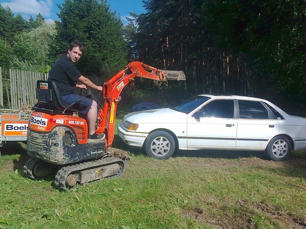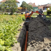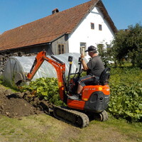 Bylo nebylo, jednoho dne jsme se rozhodli že vykopeme kanál. Teda rozhodli, ono se s tím nedalo nic jiného dělat, kanál na dvoře prostě neodtékal, po každém dešti se tam děly podivuhodné věci které fakt nechcete vidět a cítit, prošťuchování hadicí nepomáhalo. Letité trubky zvané drenážky nejspíš už asi ztratily sílu držet původní tvar. Taky nikdo netuší kam ten odpad vlastně vedl a jestli nebyl poškozen při nějakých zemních pracích. A tak přišlo nevyhnutelné, musí se tam položit nové potrubí a napojit do nové kanalizace. No super, je to dobrých třicet metrů. Chce se někomu strávit dovolenou s lopatou? Nechce? Mně taky ne. Chtělo by to bagr. V obci jeden bagrista je, jeho stroj je sice poněkud muzeální DH-112 ale umí a není drahý. Jenže pro náš účel, položení 110 mm hajzltrubky je to trochu monstrózní a taky byl momentálně mimo provoz. Při bourání sousedova chlíva se projevila únava materiálu a mechanismy stroje se začaly hýbat v nepatřičných místech. Brácha, kterému se taky nechtělo kamarádit s lopatou, začal mudrovat jestli se nedá něco půjčit, že někde viděl reklamu. A vzápětí se dozvěděl od kolegy, že jeho soused má půjčovnu minibagrů. Po zjištění co to obnáší jsme vůbec neváhali a rozhodli se strávit den dovolené se strojem