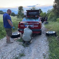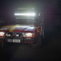 O pár kilometrů dál vymýšlí vedoucí Martin zkratku, a tak po dlouhé době ochutnáváme šotolinovou cestu lesem. Je rychlá, klikatá a trochu rozbitá. Prostě přesně taková, jakou Bedna v dálničním módu těžce nedává. Správný čas udělat servisní pauzu a letos poprvé pořádně ufouknout gumy. Hrnu se ven z auta a mířím rovnou k pravému boku Bedny, kde očekávám významný podpis nedávného blízkého setkání s kusem organické hmoty namontované na kraji silnice. K mému údivu však nenacházím vůbec nic. Jediné, co značí nějaký proběhnuvší kontakt, je tmavý pruh na bočnici přední pneumatiky. Tentokrát nás to z podběhu lehce lezoucí kolo docela zachránilo. S výrazně lepší náladou upouštím všechny gumy na rovné dva bary. Když stejnou operaci provedou i devítky, můžeme pokračovat dál.
