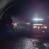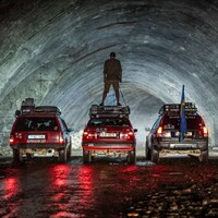 Jediným použitelným vjezdem se dostáváme do útrob základny. Mimochodem, tyto vjezdy, jenž siluetou kopírovaly tvar Migu 21 a jsou tady údajně čtyři, byly důvodem, proč na základně nikdy nebyly provozovány modernějši Migy 29… nevešly by se. Těsně za vstupní galerií se vyhýbáme masivním roxorům trčícím z odpáleného stropu a pokračujeme dále do nitra hory. Ve zdejší absolutní tmě se perfektně uplatňuje naše letošní světelná výstroj a z mlžné temnoty je tak rázem den. Hned u první slepé odbočky chceme udělat pár fotek. Devítky se otáčí bez problémů, avšak Bedna s čím dál tím víc stávkujícím řízením a vrozeným menším rejdem si musí trochu nadjet. To by v širokém prostoru tunelu neměl být žádný problém. Ani ta trocha bordelu a sutě u jeho krajů ji přece nemůže zastavit.
