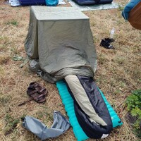Když dnes vyšlo slunce, byl jsem už dávno vzhůru. Dílem proto, že se nám nedaří a dnes se bude tak trochu lámat chleba, dílem proto, že se na mně během dnešní noci nakrmili snad všichni komáři z okruhu deseti kilometrů. Byť jsem se těm krvelačným mrchám snažil maximálně schovávat ve spacáku, kousek odhalené kůže si vždycky našli. A to jsem se večer stříkal repelentem. Teda, jako repelent mi to podala posádka Ladyboxu a vzhledem k tomu, že oni vypadají docela v klidu, začínám mít lehké pochybnosti. :D Na rozdíl od nich já totiž vypadám, jako kdybych měl mor… a k tomu to všechno pekelně svědí. Nejlépe to vyřešil Mičas, jenž si v noci postavil improvizovanou moskytiéru z jednoho z kempingových stolků a části stanu.