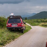 Silnice se však brzy zužuje, a tak zvolňujeme tempo, Květoš v Talbotu čeká na zbytek své skupiny a mizí v dálce za námi. Silnice vede podél prudkého svahu a z pravé strany je aktuálně lemována jen dřevěným zábradlím vzdáleně připomínající svodidla. Úzký, lehce zanedbaný asfalt se klikatí okolo hory a vzhledem k tomu, že jedeme s Bednou poslední, dost často míříme do zatáčky naslepo, odkázáni jen na vysílačky dvou červených krabic před námi. “Náklaďák,” zachrčí z reproduktoru Martinův hlas. Instinktivně šlapu na brzdu a tahám crossku ke krajnici. I když jsem pravými koly hluboko ve vegetaci, míjí nás nákladní Mercedes jen o centimetry bez toho, aby se snažil nějak výrazněji zpomalit. Prostě “vítejte na Balkáně”. :)