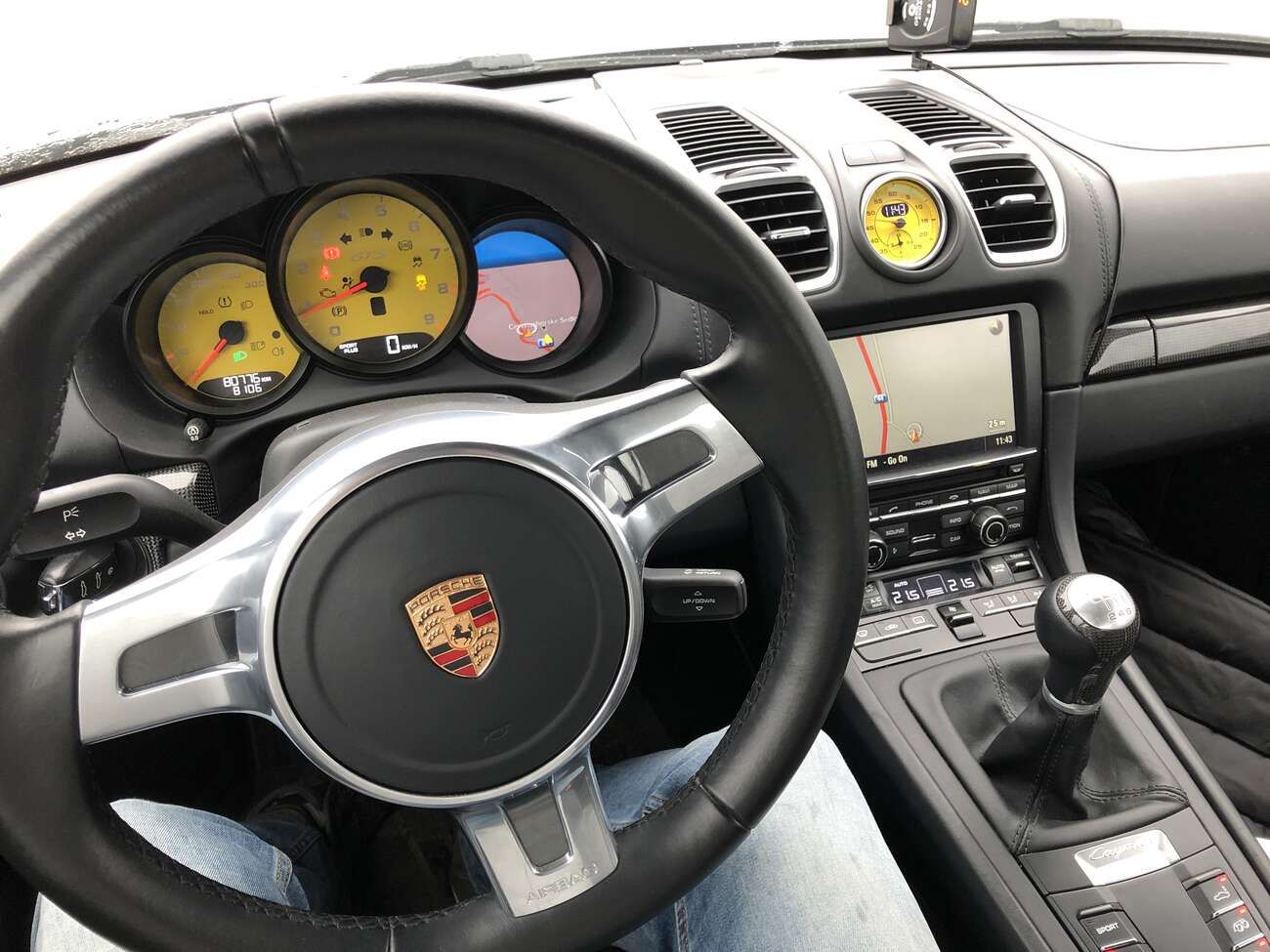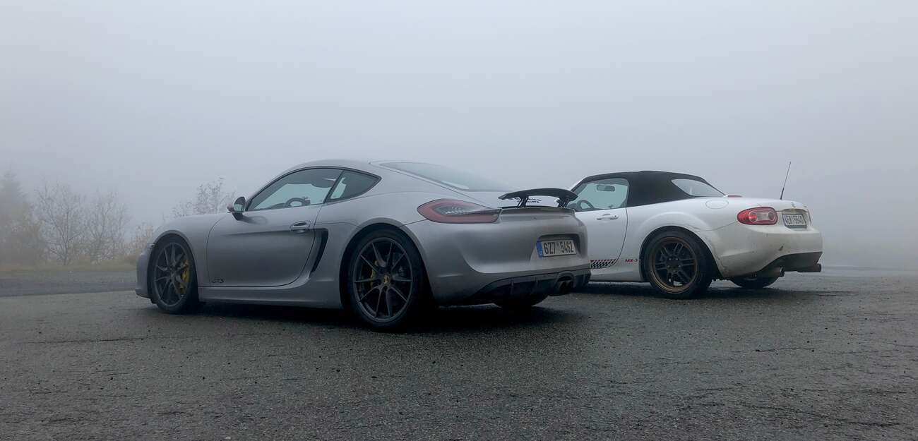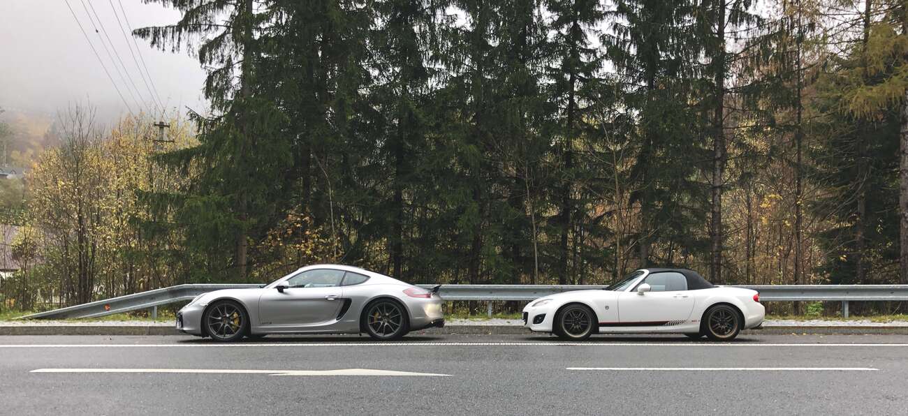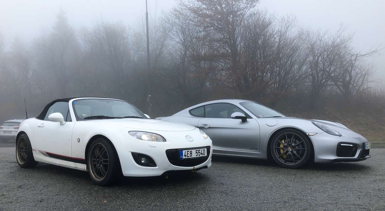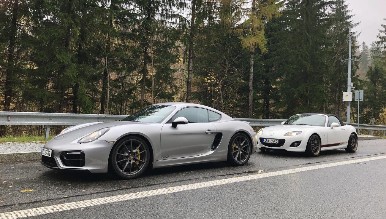 Původním cílem bylo protáhnout tu malou japonskou svini a užít si díky oslizlým cestám aspoň pár chvilek pocitu, že je nezvladatelná a přemotorovaná. Rovnou přiznávám, že se to povedlo snad ještě líp, než bych čekal. Ale kvůli tomu tenhle blog nepíšu. Vedle Miaty tady totiž stojí jakýsi šedý krokodýlek a výhružně na mě trčí křídlem. Je to Cayman GTS 981, ještě před faceliftový, takže není poháněn nějakým trapným maloválcem, ale za zadními sedadly mu buší tradiční plochý šestiválec 3,4 litru o výkonu 340 koní. Je vybavený manuální převodovkou, úchvatnými skořepinami a karbonkeramickými brzdami. Normálně bych na tomto místě zabředl do technikálií, okomentoval interiér, přidal nějakou filozofickou glosu… …ale teď by to bylo úplně zbytečné.