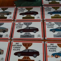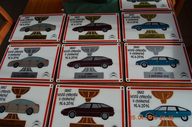 Co zbývalo ještě pořešit, tak trofeje. Nechtěli jsme klasické poháry, které se dají koupit na internetu. Chtěli jsme "něco víc". Kolega z teď už bývalé práce a kamarád, který dělá lakýrníka přišel se super nápadem udělat cedulky. Já sice měl jiný plán, ale tenhle mi přišel super. Ale ne nechat vyrobit takové ty, které se dnes dají všude koupit. Nechal se vypálit plech o rozměru papíru formátu A4 s oky pro pověšení, stříknul se bílou perletí, přes šablonu se nastříkala čtyři různá auta (DS, CX, XM a C6) v barvách ze vzorníku barev daných aut, každé auto dle kategorie soutěže, detaily se vyřešily samolepkami a celé se to přelakovalo 14 vrstvami laku, aby v místech samolepek nevystupoval lak nad povrch. Výsledek byl i přes výrazné problémy s technologií úžasný. Strávili jsme na tom (tedy hlavně kamarád) přes měsíc přerušované práce. Vždy po práci jsme zašli k němu do dílny a laborovali.