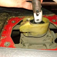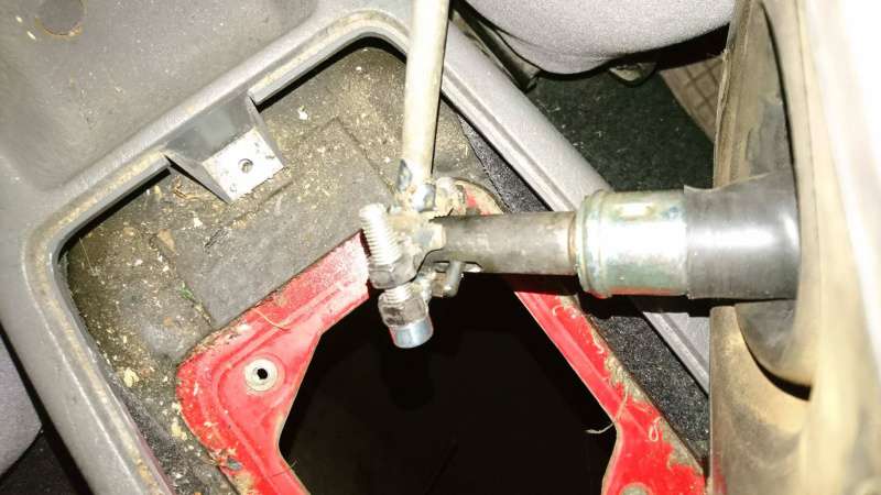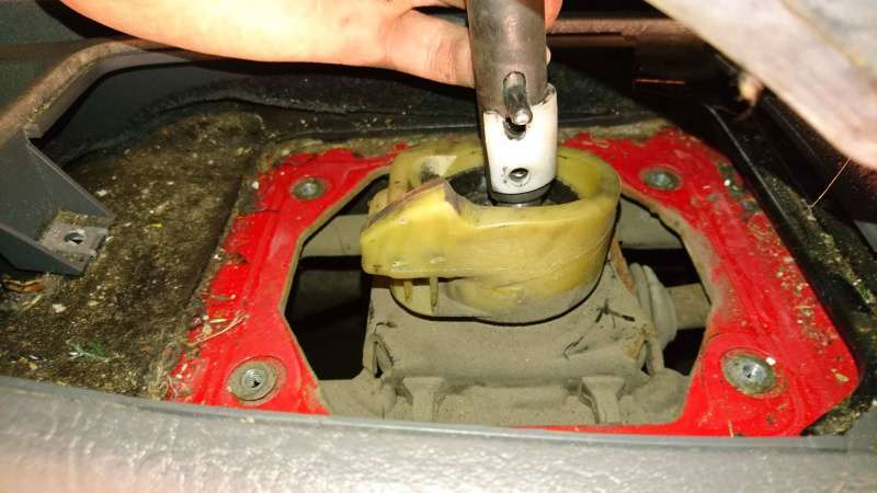 Výfuk šel dolů lehce (ikdyž je zrezlej), s kardanem jsme lehce bojovali, ale nakonec se podařilo i to. Dále bylo potřeba odmontovat nějaké plechy, které byly upevněny na komplet zrezlých šroubech. Aby mohla převodovka dolů, musí se rozebrat i část interiéru – kvůli řadící páce. Během tohoto procesu odstrojování jsem zjistil, které plastové části neodolaly zubu času. Že toho ale je: popelník, rámeček kolem řadící páky, řadící páka, madlo ruční brzdy. Vše je nějak prasklé nebo nějak poškozené. Je to jen kosmetika a na funkci to nemá vliv, snad se časem dostanu k sehnání nezničených dílů. Teď už k samotné řadící páce. Dle instrukcí od kluků ze Sierra klubu by měla jít řadící páka „jen“ silou nahoru, ale prý může solidně držet, za 27 let existence.