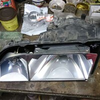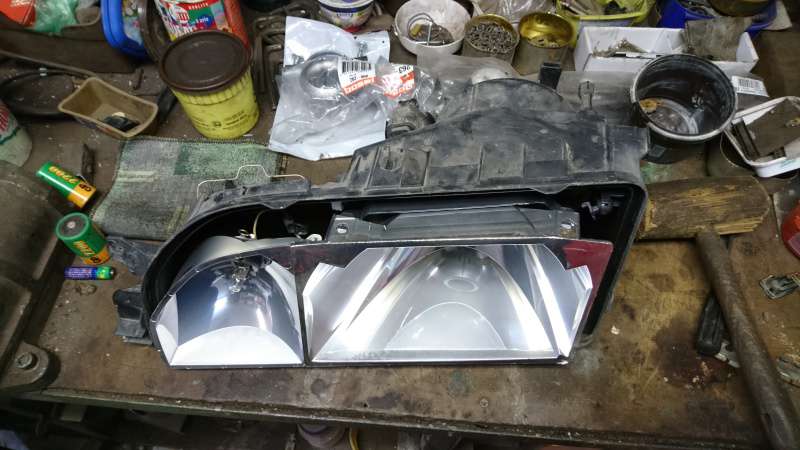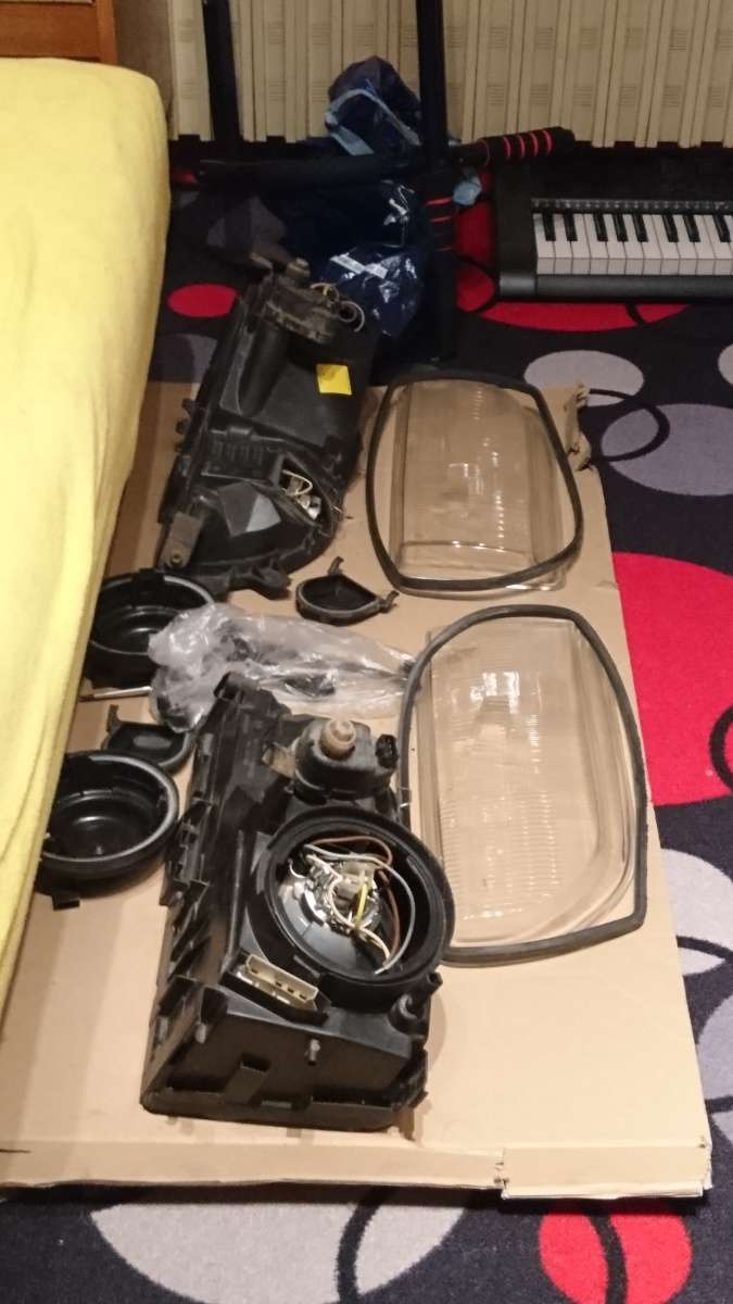 Nějakému svařování jsme se nevyhnuli a strýc mi svařil vše dohromady. Instalace a následné dotvarování kladivem už bylo otázkou pár minut. Výfuk a katalyzátory jsou vyřešené, o starost méně. Já potom ještě složil dohromady interiér. Mezitím se mi podařilo sehnat pár origo BOSCH světel, s elektrickým naklápěním. Konečně by auto mohlo normálně svítit a taky ovladač v interiéru na naklápění nezůstane nevyužitý. Bohužel jedno ze světel mělo rozlámaný mechanismus, co ovládá to naklápění, takže jsem ještě dodatečně po všech čertech (sierra klub) sháněl jen tento mechanismus. Nakonec sehnáno a světla byla komplet rozložena, vyčištěna a zase složena zpět. Se světlama jsem pořídil zároveň takový černý plast, co patří mezi zadní světla po SPZ. Ten co je na autě je celý popraskaný, tak zasloužil vyměnit.