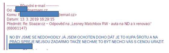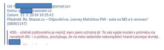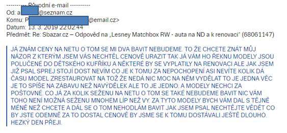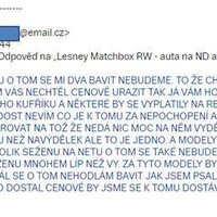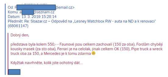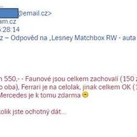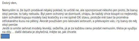 Dozvídám se, že s nimi bude práce a barvy že stojí peníze. Není mi jasné, proč to má být argument, v návalu vzteku píšu mail, že pokud to pán vidí takto, tak to se s ním ani dohodnout nechci, a že argumentu s cenou barev nerozumím, byť vím, že nejsou zadarmo…a že za poštovné je rozhodně nenechám. Pak trochu vychládám, a navrhuju ještě alternativu, dle mého názoru přijatelnou. Srazil jsem cenu o nějaké dvě stovky, když budu počítat poštu, tedy o cca 30%. To už by mělo být zajímavé…přece jen, modely nemají poškozená skla, ani nejsou deformované, což bývá u takhle hraných autíček poměrně častý problém.