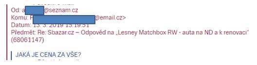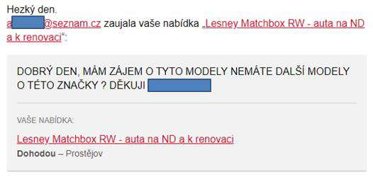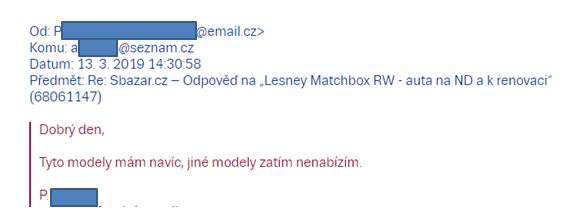 Vzhledem k ochraně osobních údajů zakrývám jména i mailové adresy, ale nebudete mít problém rozpoznat, kdo je kdo….nicméně, zatím to začíná dobře. Pán má zájem, a chtěl by i jiné modely, pokud mám. Mám, ale pro vlastní potřebu, a tak pána musím zklamat.