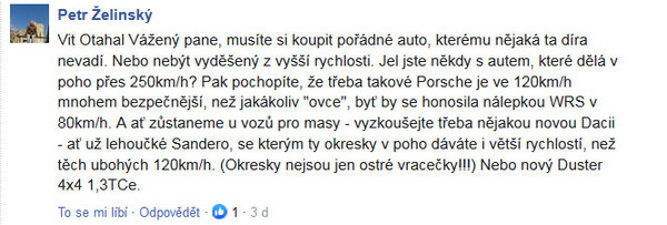 26. 11. 2019, 10:36Ten borec tam fakt píše o Porsche a druhým dechem mluví o tom, že Sandero seká okresky ve více jak 120 km/h:D Který? To bych chtěl vidět... A Porsche je bezpečnější než OC RS... No proto nemám chuť se účastnit podobných diskusí:)