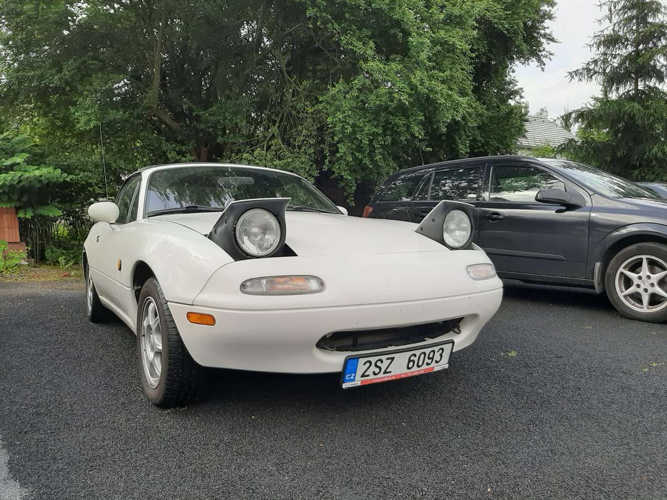 Jenže to bych nebyl já, aby mi nezačalo vrtat hlavou, kde bych mohl splašit něco jinýho. Nedávno jsem byl na srazu MX-5 a nějak jsem trochu záviděl lidem s mrkačkama intenzivnější, syrovej oldschool zážitek. Říkal jsem si tam jaký to asi je, jet na srazu občas v solidním tempu – který působí i v NC svižný – v autě technologicky o 16 let starším. Na základě předchozí kladné zkušeností se zápůjčkou Alfy Romeo Spider (1984) jsem napsal Adamovi z iCabrio a překvapivě na neděli s hnusně deštivou předpovědí nikdo jeho NAčko neměl zamluvené, takže jsme se domluvili a v sobotu večer jsem si tu bílou vykulenou mršku odvezl (a Legenda tam nechal přespat pod dohledem ostatních kabroušů).