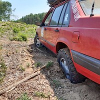 S tímto zjištěním utahuju znovu šrouby horního uložení tlumičů a vyrážíme směr check point. K mýtině se vracíme několik set metrů směrem, ze kterého jsme včera přijeli, což trvá opravdu jen okamžik. Vlevo vidíme v písku vyjeté koleje směřující přes stráň do průklestu – to vypadá nadějně. Ovšem jen do okamžiku, kdy se přehoupneme přes vrchol. “Cesta” velmi rychle končí a okolo jsou jen větší, či menší pařezy. Což o to, některé by se i dalo přejet, či se jim vyhnout, ovšem všudypřítomný písek není přesně to, co v tuto chvíli chcete. To velmi rychle zjišťuje Logan s tůlejtem, který během okamžiku sedí diferákem na sypkém podkladu. Při pár pokusech o vyjetí, si drapáky na zadní nápravě sedanu vyhrabali dvě docela solidní jámy a jindy excelentní RWD, je nyní odkázáno na pomoc jiného auta. To je opět něco pro Bednu. Letošní první zkouška dynamického lana proběhla nad očekávání dobře a na druhý pokus je Toolate z písečné pasti venku.