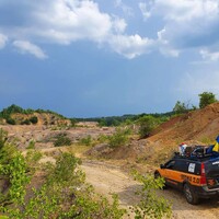 Otáčíme auta a vyrážíme na pomoc. Po chvilce tápání nacházíme cestu do lesa na jejímž konci seděl ještě před chvilkou v bahně uvízlý sedan. V mezičase, co jsme hledali místo jeho uvíznutí se však dokázal dostat vlastními silami ven, takže následuje další otočka a po patnácti minutách se nám již otevírá pohled na krásné panorama bývalého dolu na jíl – “měsíční krajinu“.