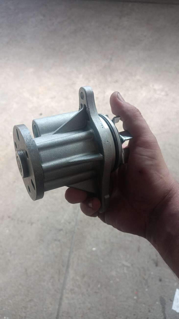 Ještě veselá příhoda s vodní pumpou… Tady je vodní pumpa na řemenu příslušenství. JENŽE není to samostatný agregát jako altík, ale je strčená do bloku. Takže bez shození krytů rozvodů se k ní nedá jinak dostat (na druhé fotce ten svítící hliník v černé díře). Vzhledem k tomu, že jsem na to byl upozorněn, sehnal jsem jinou. Je ale zajímavý, že ta, co je na autě, na to, že tam byla cca 50t km, tak už má na hřídeli vůli, jak prase (cca 1-2 mm). A měněná být měla (nebo aspoň na faktuře z autorizovaného servisu, kde to na rozvodech před tím bylo, tak je, ale kdo ví, jestli byla nová i fyzicky na autě). Zajímavostí je, že místo, aby měla osičku dlouhou třeba 5 cm (kdyby byla na rozvodech), tak ji má dlouhou od vrtulky po řemenici cca 15 cm. To je páka, jak prase, když na to tlačí řemen příslušenství.