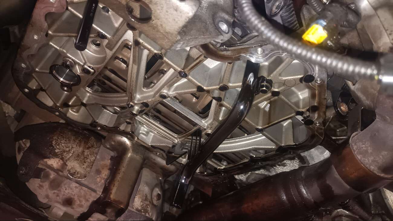 Tak se zatím vrhnu do sundavání vany, abych to měl pak rovnou připravené na výměnu pumpy (tady není pumpa klasická zubačka na řetízku/ozubeném kole, ale excentrická zubová pumpa, kde středem rotoru vede klikovka a obal pumpy je i kryt bloku pod pístem). Musí přesto dolů vana, protože pod ní jsou další šrouby, které pumpu stahují, vzhledem k tomu, že mezi vanou a blokem je ještě mezikus, díky čemuž není vidět ani na klikovku zespod po sundání vany (sic!!! hledám si čísla na vrakáče v okolí). U normálního auta není na sundání vany nic strašnýho, maximálně se shodí výfuk. Ale ouha. Tady je výfuk, potažmo výfukové potrubí v celku s rezonátorem ze dvou stran. To by taky ještě nevadilo, ale dost blbě se může ke šroubům na vanu (volám vrakáč). Jenže sundat tyhle dvě části výfuku znamená to vyndat z turba a to je opich a přístup, jak k penězům i při sundání agregátů příslušenství. Ještě dejme tomu. Na 3x zlomené prsty a upravený klíče to jistí, abych nemusel k turbu. Vana povolená, jenže furt nejde dolů… Proč, kur.a… Aha, z třetí strany je ještě totiž konzole pro motorové příslušenství (volám vrakáč, ať si chvátne s příjezdem). Takže vypustit klimu a sundat klimakompresor, alternátor, servopumpu (ta naštěstí nemusí dolů úplně, aby se musel ještě vypuštět systém s LDS). Vzhledem k přístupu ke všemu spojováku výživná práce. Po povolení konzole (skoro všechny šrouby poschovávané pod výše zmíněnými agregáty) jde konečně vana dolů…