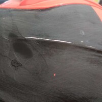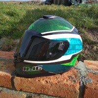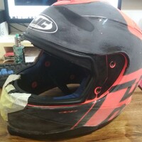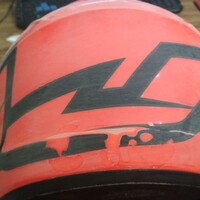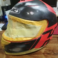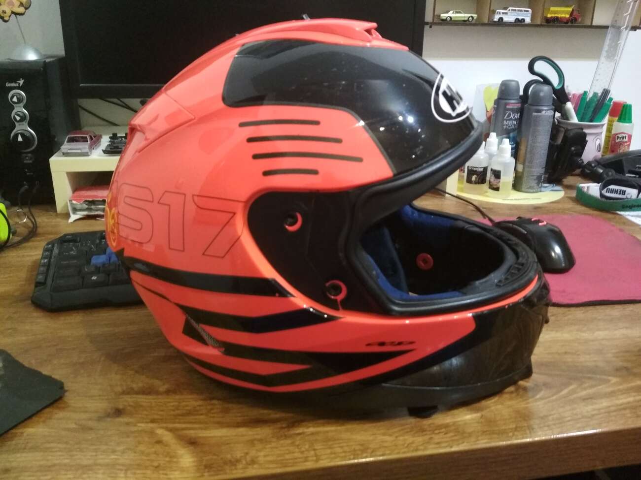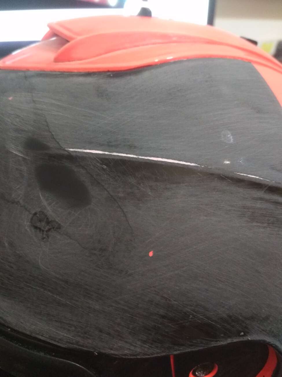 Při téhle proceduře jsem si všiml, že moje čtyřleté HJCčko má to nejlepší za sebou, tedy hlavně navenek – hmyz, odletující kamínky a semtam moje nešetrné zacházení (človek s ní při manipulaci občas někde zavadí…) se na něm neblaze podepsalo. Helma je oranžová termoplastová skořepina, na ní je černé tampo a svršek čirý lak, který byl na čelní části oprýskaný a začínal se loupat. Semtam důlek po kamínku, semtam škrábanec, přemýšlel jsem, co s tím. Nejsnadnější (a nejdražší..možná? Uvidíme na závěr…) řešení by bylo pořídit jinou helmu, nebo prostě dál jezdit ve staré s viditelnými battle scars. Já ale snadná řešení nemám rád, nepředstavují žádnou výzvu. A když už mám doma ten airbrush…….