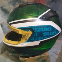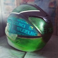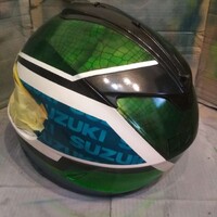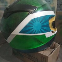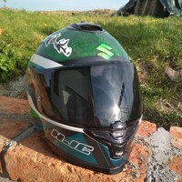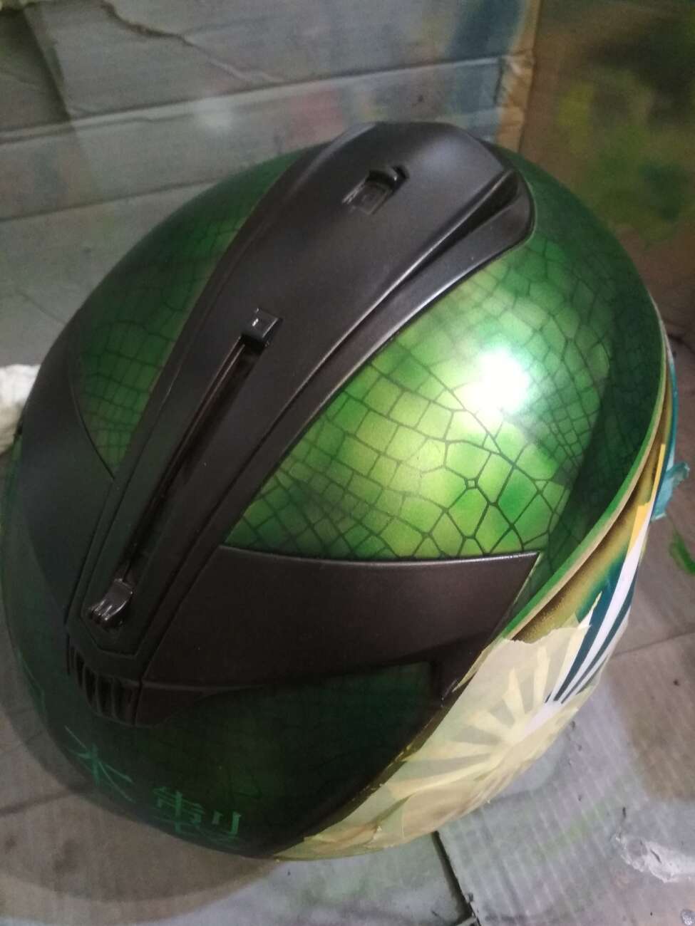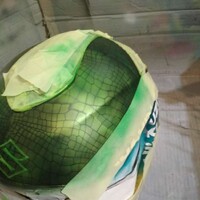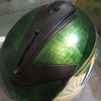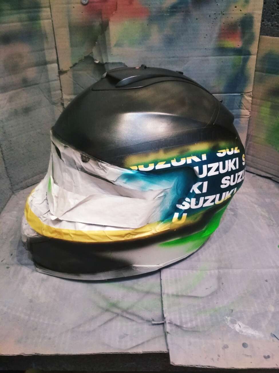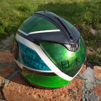 Stejný způsob jsem použil při lakování lícních částí a zadku helmy – ale jako podkladovou barvu jsem zvolil fluorescentní zelenou. Výsledný efekt je odlišný od temene, což mi vyhovuje, chtěl jsem to tak. Zbývalo domaskovat a dolakovat boky a bradu, použil jsem opět perleťovou modrou, tentokrát bez přelakování transparentní modrou, takže výsledný odstín je trochu tmavší. Zbývalo zalakovat čirým lakem, a se zatajeným dechem strhat maskovací pásky. Bohužel, tím, jak byla helma prakticky tři měsíce oblepená, lak na pár místech k pásce přilnul, a strhl jsem ho až na základ. Naštěsí je vše opravitelné, s trochou snahy…vytvořil jsem tak navíc černý pásek nad průzorem, který jde přes znak “S”, a decentní tenkou černou linku kolem spodku celé helmy. To mi pomohlo schovat nedostatky, kterých jsem se dopustil. Finále je zatažené dvěma velmi silnými vrstvami dvousložkového čirého laku, které celé věci dal hloubku a zdůraznil perleťový lesk.