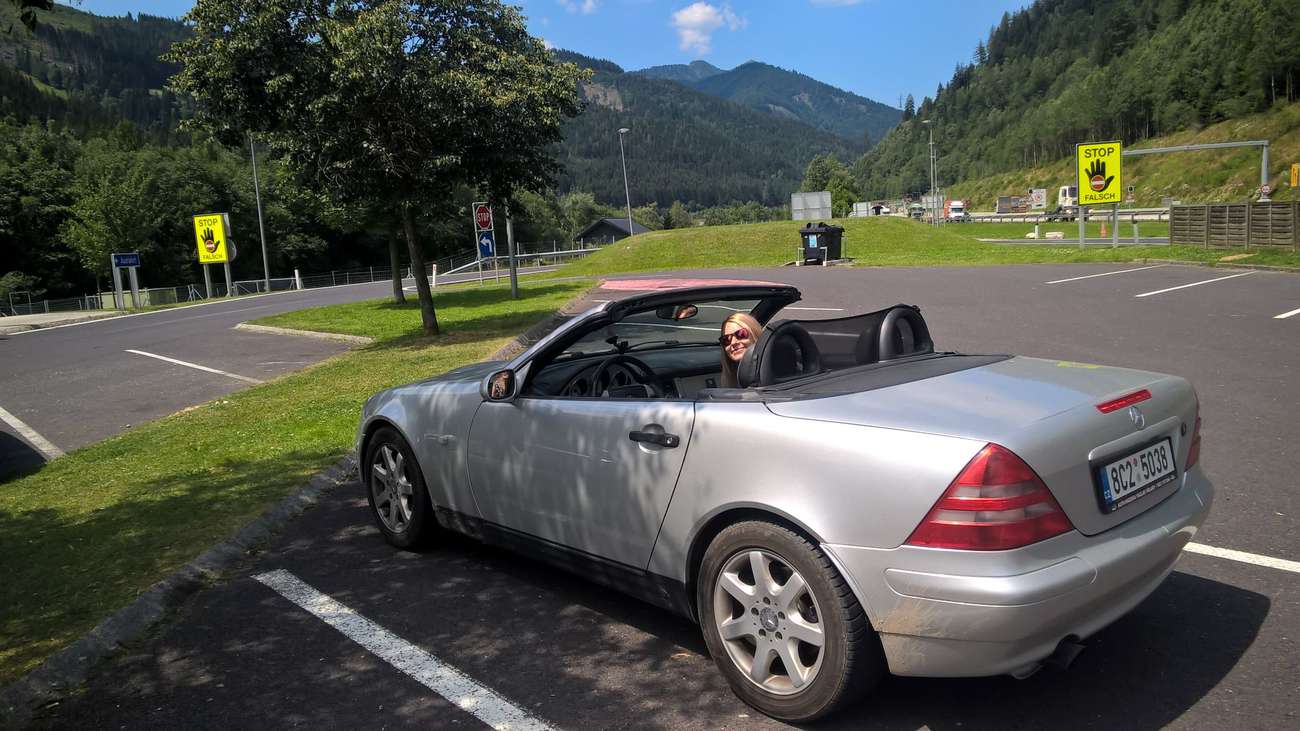 Chtěli jsme se po cestě podívat na pár míst a nestresovat se. Můj návrh na jedno přespání v autě se trochu překvapivě setkal s nadšeným přijetím, a tak jsme vyjeli o den dřív. Předem upozorňuji, že do té doby auto fungovalo bezchybně a dělalo mi radost. Vyjeli jsem tedy z Českých Budějovic a přesně na hranicích do Rakouska (tedy po prvních 45 kilometrech, z celkových plánovaných cca 2.500) přestala jít klimatizace. Půlka července, teploty vysoko nad mojí přijatelnou hodnotou, prostě úžasné. Ale je to kabrio, sice to praží a čelo a nos se pomaloučku (vlastně docela rychle) připalují, ale vítr je příjemný. Jízda se staženou střechou, vytaženými bočními okny a nasazeným větrolamem (taková síťka) mezi zadními ochrannými oblouky je příjemná do cca 100 km/h a chvilkově akceptovatelná tak do 110 – 120 km/h. Pak už je to prostě moc a občasné poryvy větru vás začínají nepravidelně pleskat do obličeje. Problémem při dlouhé rychlé jízdě po dálnici bez střechy je taky s výfukem. Co mám na okreskách a ve městě opravdu rád, mě teď začíná pěkně štvát. Dunění je prostě najednou moc a bolí z toho hlava. Takže nastává dilema mezi tím jet pomaleji bez střechy s větrem v kabině a hlasitým výfukem ale v příjemných teplotách nebo zatáhnout střechu a zrychlit na povolené dálniční limity, ale zase se trochu smažit. Před Linzem už pomalou jízdu nemůžu vydržet, natahuji střechu a konečně můžu frčet 130 (a možná i o „něco“ víc). Jak pak zpětně po dvou týdnech zjišťuji, nebyl to dobrý nápad. Dálnice kolem Linze je totiž omezená na 110 km/h, čehož jsem si nevšimnul. Takže jedna pokuta za rychlost v Eurech. Pak zas nastává období jízdy pomalejší rychlostí bez střechy, které pravidelně střídá rychlá jízda se střechou nahoře lehce nad limit, abych tu časovou ztrátu dohnal. Jak všichni víme, provoz o prázdninových dnech není ideální a čím víc se jede na jih, tím je to horší, ale musím SLK pochválit. Na dálnici je jako dělané a jede na tak staré auto prostě úžasně. Převodovka je sice jen pětistupňová, ale díky slušnému výkonu může být dlouhá a pětka při 130 km/h pořád točí pod 3 tisíce otáčet. Auto má vynikající aerodynamiku – je malinké jak výškou, tak délkou, přední maska i čelní sklo jsou dost skloněné, malá světlá výška nedovolí vniknutí příliš mnoho vzduchu pod vůz a auto krásně krájí vzduch i v rychlostech vysoko nad dálničním limitem.