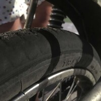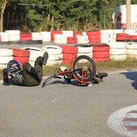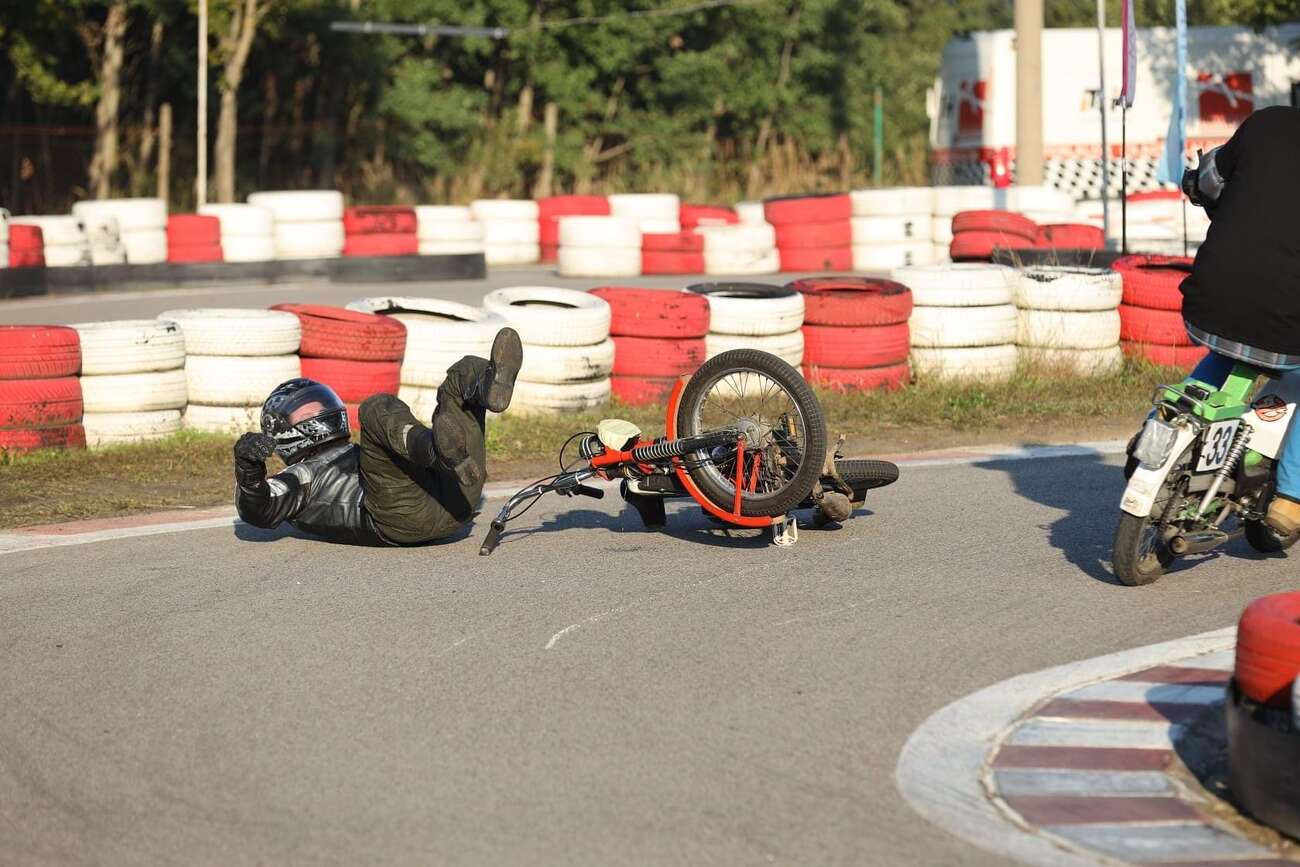 Babetta se kroutí, pneumatiky se žvýkají, stojany škrtají o asfalt a nám navíc zavazí onen krásný Hikone výfuk, který nás omezuje v náklonu v pravotočivých zatáčkách. Tak dlouho se škrábe výfukem o asfalt, až se odlehčí zadní kolo do bodu, kdy ztratí toliko žádanou trakci a začne se předbíhat dopředu. Připisuju si svůj první pád a odměnou mi je nejhezčí fotka ze závodu.