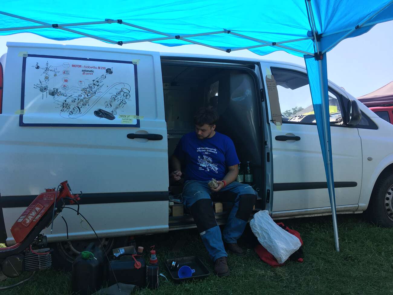 Den se překulil do druhé půli, střídání jezdců a tankování máme zmáknuto, stejně tak posunování stoliček do stínu. Z boku dodávky jsme si udělali tabuli s časy tankování a nástěnku s plakátem rozpadu motoru na okrasu.