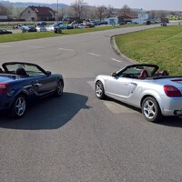 Rozhodli jsme se s Davidem, že shrneme to, co probíhá v různých diskuzích ať už přímo v blogu, co píše David, nebo kdekoli jinde a podělíme se se všema AUTÍČKÁŘema o naše dojmy ze dvou na jednu stranu stejných, na druhou stranu velmi odlišných Toyot MR2 (prozatím) poslední generace. O specifikacích toho už bylo napsáno hodně, takže jen v rychlosti. Má (modrá) MR2 – naprostá série, motor 1ZZ-FE (140 hp), 5q bez LSD, obyčejné silniční pneu. Davidova stříbrná – swap na 2ZZ-GE (192 hp), 6q včetně LSD z Toyoty Celica 7q TS, pneu Yokohama Advan Neova AD08r. Obě auta váží něco málo pod tunu. Společný máme oba komplet stavitelný podvozkový kit XYZ Supersport plus komplet PUR silentbloky vlastní výroby z dílny DICompRacing, kde byly i oba vozy stavěny/servisovány.