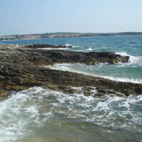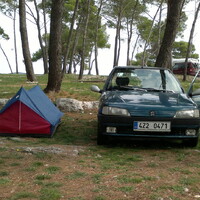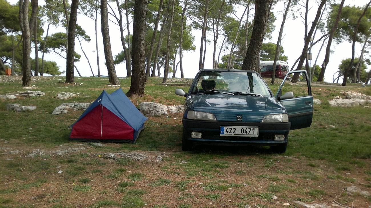 Po dalších pár kilometrech na magistrále začalo auto děsivě vrzat už při malém zatáčení. Zatáčky tedy „nadjíždíme“, jako kdybychom byli kamión – jen žádné výrazné otočení volantem… Přidal se i další zvuk do orchestru – řemen už taky píská. Počítáme každý metr – může to být ten poslední. Konečně dojíždíme do kempu Medulin a jdeme se projít do stejnojmenného městečka. Je konec září, turisti nikde, jen v kempu je s námi pár Němců v luxusních karavanech, jejichž pozornost náš „orchestr“ přitáhl dokonale. Sedíme v baru a popíjíme drink. Po návratu do kempu zjišťujeme, že pro náš mikro stan bude vhodnější jiná, než návětrná strana poloostrova. Následuje tedy „nenápadný“ přesun. Po vyzkoušení dalších asi pěti stanovišť nalézáme to pravé. Parkujeme, stavíme stan (abych ho mohl následně omylem natrhnout a zbořit…) a samozřejmě vztyčujeme českou vlajku.