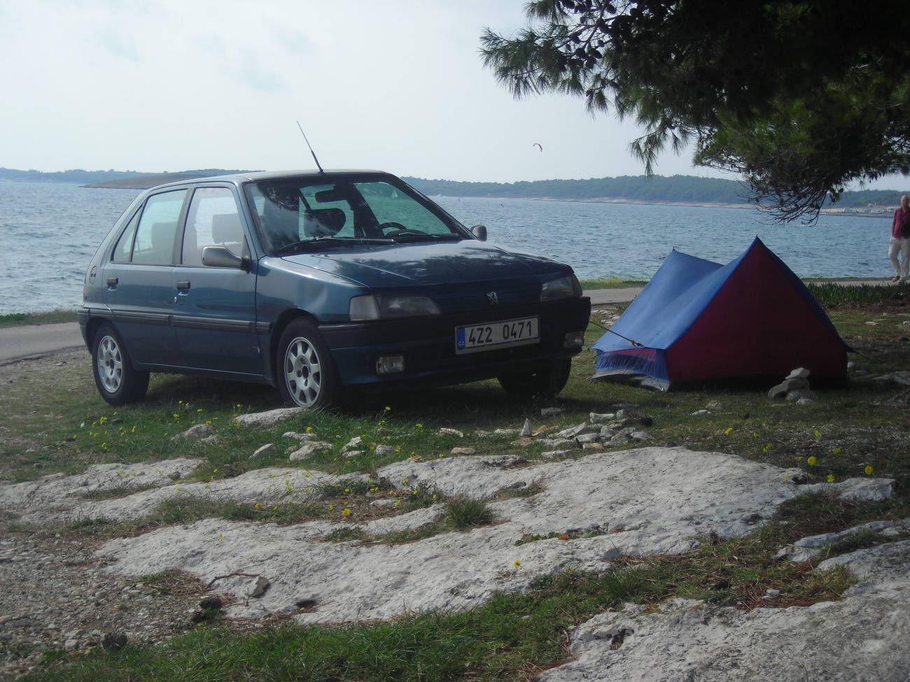 Brzo ráno dojíždíme k pobřeží a snažíme se dostat na Istrii. Nejvyšší povolená rychlost na jadranské magistrále je 60, my jedem 70 a Chorvati na nás zběsile troubí a blikají, ať přidáme. Stále se rozhlížíme, kterou cestou se jede dolů, k moři… Jedna chybná odbočka a stojíme před obrovskou lodí. Málem jsme se nalodili na trajekt, nevíme ani kam. Vracíme se tak prudkou cestou, že auto má, co dělat aby ji vůbec vyjelo. Když se dá přeřadit, jedem i na dvojku, Jinak stále na jedničku a trneme, že „Pežotka“ (jak mu familiárně říkáme) uvaříme. Objevuje se další problém – sjela se jedna brdová destička, takže brzdíme kov na kov. Tomu odpovídá i zvuková kulisa (zvuk to dělá, asi jako když brzdí vlak). Sehnat novou destičku moc nepřipadá v úvahu, a tak po důkladné zkoušce brzd pokračujeme dál. Na všech ostatních destičkách je obložené dostatečné. Vpravo od nás skály, vlevo zase sráz nad mořem. Před námi se klikatí úzká silnice magistrály a za námi doráží zuřiví Chorvati. Nalézáme malé odpočívadlo a zvedáme auto na hever. Naznali jsme, že riziko ze zjištěných závad (poloosy, čepy, brzdy, …) je přijatelné…