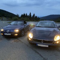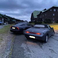 Ze světel, míhajících se ve zpětném zrcátku se s ustupující tmou čím dál víc dají rozpoznat obrysy Alfy spideru 916. Takhle v zrcadle je to fakt pěkné auto. Jsem vlastně rád, že nejedu druhý a nemusím se koukat na ten prapodivný zadek a přemýšlet, jestli se mi líbí, nebo ne…zepředu mám jasno, ALFA :)