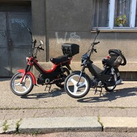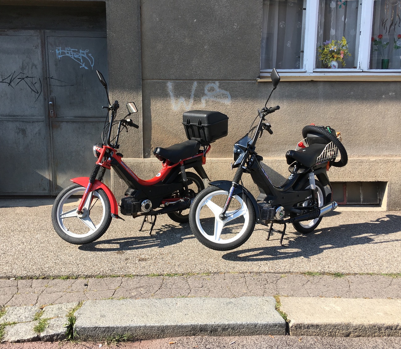 JM: Červeného mopeda jsme koupili s babičkovským košíkem, černý moped bez. Já jsem si na červený stroj koupil zadní hrazdu s kufrem, přímo originál Manet, takže jsme to prohodili, košík šel na černý stroj a já si koupil postranní brašny. Ty byly ale fakt velkej porod, nejenže bylo málo brašen v ucházejíci velikosti a cenové kategorii, ale musel jsem si je přešít, protože jsou původně určeny na kolo a to má tunel pro zadní kolo cca 15 cm, kdežto na Manetu je to cca 22 cm.