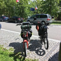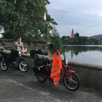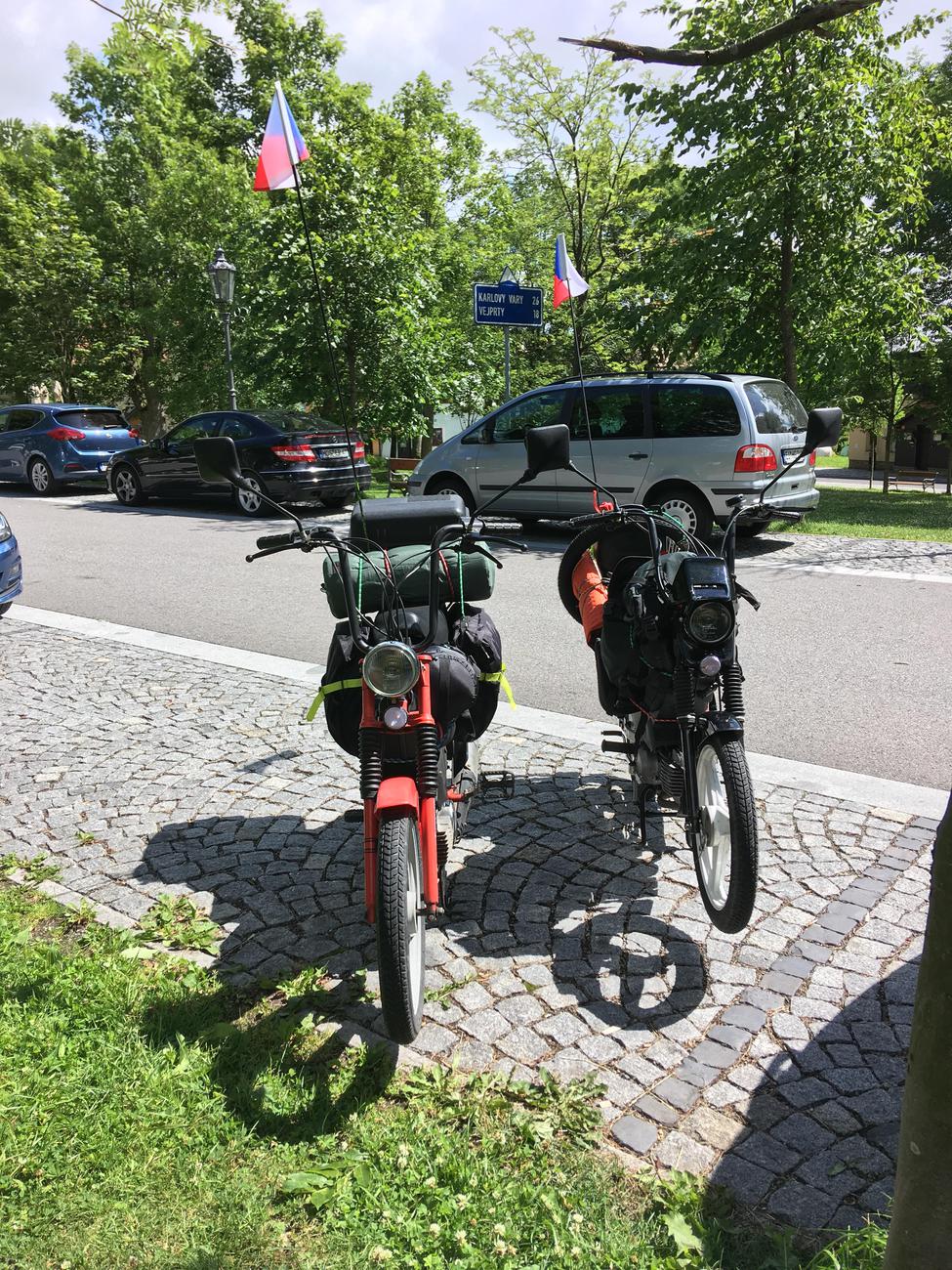 JZ: Co se týče výběru našich strojů, požadavky na ně byly jasné – co nejjednodušší stroj s malou spotřebou, vysokou spolehlivostí a možnost řídit tuto "mašinu" s řidičákem na auto. Já ani Jáchym totiž nemáme řidičák na opravdovou motorku. Původně jsme chtěli pořídit babetty, jelikož se jich po ČR válí spousty a je snadné na ně sehnat ND , avšak po přečtení několika recenzí a vyslechnutí mnoha nechvalných slov na spolehlivost těchto strojů jsme začli hledat něco jiného. Na doporučení mého otce a také kamaráda, který dělal na tomto mopedu kurýra, jsme se rozhodli pro Manet Korado. Jedná se o moped vyráběný na Slovensku, vybavený kvalitním motorem Puch rakouské výroby, který byl vyroben podle licence italského výrobce motorek Piaggio. Čili se jednalo o relativně spolehlivé stroje, další obrovskou výhodou těchto mopedů je, že pokud byly vyrobeny do roku 2001, nepodléhají klasické evidenci. Čili tyto stroje nemusí mít SPZ, evidenční kontrolu, emise a ani STK a také není nutné je přihlašovat do registru motorových vozidel. Stačí tedy jen povinné ručení (které stojí cca 160 kč na rok) a osvědčení od výrobce o tom, že vozidlo je způsobilé pro provoz na pozemních komunikacích.