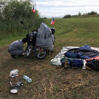 S sebou jsme balili jen to nejnutnější, něco málo oblečení (trochu jsme nepočítali s 9° C uprostřed léta), hygienu, spacáky a karimatky (já jsem v klidu s péřovým ale Kuba má jen takovou dečku, tak v noci trošku klepe zubama), vařič a ešusy, powerbanky na naše čelovky, telefony, repráčky atp., už zmíněnej nekompletní stan (dneska jsme si vyzvedli zbytek), kanystr a 2T olej, plachty na motorky proti dešti a něco málo z nářadí a náhradních dílů, hlavně svíčky a žárovky, duše, jeden plášť a spojky řetězu.