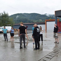 Rychlá kontrola aut odhaluje, že skoro všichni si z pravé koleje vezou za ráfkem pozdrav v podobě hlíny a trávy i s kořeny což znamená, že to dřív nebo později skončí pomalým defektem. Řešení je jednoduché, zrovna jsme vyjeli z hor, takže místo vytahování rezerv využijeme služby místního pneuservisu… Teda pokud by byl zrovna otevřený. Prý tak možná zítra. No nic, je tady aspoň wapka, takže zkoušíme z kol vymýt co jen jde a následně se stavujeme na oběd ve vedlejší restauraci. Jurský park totiž musí přezout rezervu, protože jeho kolo opravdu dost uchází. My ostatní na to zatím drbeme s tím, že nám tlak drží. Během chvilky se ukazuje, že toho servisování bude před restaurací trochu více. Espace má krom defektu ještě problém s urvanými dorazy zadní nápravy, takže jeho kufr zmenšil už tak malý odstup od terénu na absolutní minimum. Octavia pak pro změnu platí tvrdou daň za nepovedený sjezd a její posádku čeká místo oběda rovnání ohnuté tyčky řízení, aby ji opět naučili jezdit rovně a nešmatlat na pravé kolo. Naštěstí se to během dvaceti minut docela daří a po jídle jsou všichni připraveni na pokračování. A to včetně dvou nových vozidel v naší minikoloně.