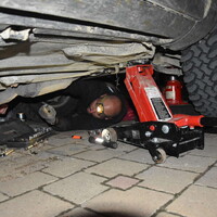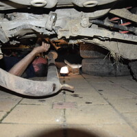 Dáváme rychlou večeři a jde se na věc. Každý pomáhá jak umí. Pod autem je standardně okolo pěti lidí a práce se docela daří. Obzvlášť na to, že má auto najeto přes 400k km a většina šroubů nebyla za celou dobu nikdy povolená. Sundat šusplech, vyvěsit výfuk, povolit zbytky středního uložení a pak to nejhorší, spousta imbusových šroubů plných bahna, kde strhnutí i jednoho znamená docela velký problém a časovou ztrátu. Jedna strana jde docela dobře, na druhé však imbus v několika šroubech bezradně proklouzne… A to je problém. Právě na zadním rozpadlém kloubu není práce s flexou úplně ideální. Hlavy šroubů jsou tady relativně utopené a poslední co chci, je nevratně zničit unašeč od Haldexu. Naštěstí pár fíglů s kladivem zabírá a kardan se válí na zemi vedle auta. Trvalo to jen nějaké dvě hodiny. S naším minimálním vybavením by se za tuhle práci nemusel stydět ani středně velký amatérský team na Dakaru, tedy pokud by tam nějaký byl a všichni jeho mechanici by měli zlomenou minimálně jednu ruku.
