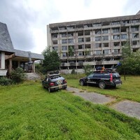 Objíždíme budovu hotelu a parkujeme vedle Dana. Před námi je nižší barák spojený chodbou s hlavní budovou. Že by naše hledaná tělocvična? Po překonání několika překážek v podobě ledabyle odložených židlí, sedacích souprav a kulečníkového stolu v pokročilém stádiu rozkladu, zjišťujeme, že jsme nikoliv v tělocvičně, ale v hotelové restauraci… tedy v tom, co kdysi bývalo hotelovou restaurací. V kuchyni dokonce zůstalo pár kotlů a několik nerozbitých talířů s logem hotelu. Zbytek však podlehl nejen zubu času, ale také nájezdům vandalů. V horním patře ještě nacházíme nejspíš původní kancelář ředitele hotelu. Klestíme si cestu zpět k autům, když v tom se naše pohledy potkávají na vysoké hotelové budově. "Vidíte ten balkon úplně nahoře?"