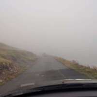 Stoupáme stále výš a výš, serpentiny se postupně natahují a přibývá delších napřímených úseků, které však stále v nekompromisním úhlu směřují k vrcholu masivu. V nepřímé úměře se stoupající nadmořskou výškou klesá venkovní teplota, což se docela líbí automatu, a také viditelnost, což se hodně nelíbí mě. Pár set metrů pod vrcholem už není vidět pomalu na krok a zadní mlhovka Meganu se téměř ztrácí v okolní bílé kaši.