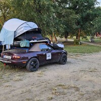 Je fakt vedro, do toho ten servis na slunku na parkovišti. K soše se nám tím pádem nechce, víc nás láká lom. To osvěžení je parádní, nechce se nám pryč. Ale musíme, když chceme ještě dnes dojet do Rumunska. Vyrážíme směr Satu Mare. Na hranicích to je v pohodě. Večer jsme na kontrolním místě, malý hrad Ardud. Zde se bavíme s ostatními, jak to vidí s noclehem. Většina to jede zkusit k přehradě Apa mezi Satu a Baia Mare. Přidáváme se. Domnělý kemp je za branami a jede se kolem hotelu. Vjezd hlídá jeden Rumun. No domluva s ním je, prostě jak s Rumunem. Po chvilce se povede, něco mu zaplatíme a míříme na nocležiště za ostatními. Je nás tu Gumídků docela dost, včetně Miaty se střešním stanem, autobusu Mercedes a dvou maďarských posádek. Kluci se jdou koupat, já rozdělávám gril. Další hezký večer před námi. Do toho k nám přijde jeden Maďar s pálenkou, dojde na výměnu mečů (pálenek), naštěstí jde brzo dál. Já s Ferem znova spíme pod širákem, což tak nakonec bude po celý Gumbalkán a Kryštof si ustýlá poprvé a pak už napořád v autě.
