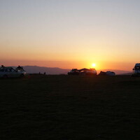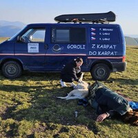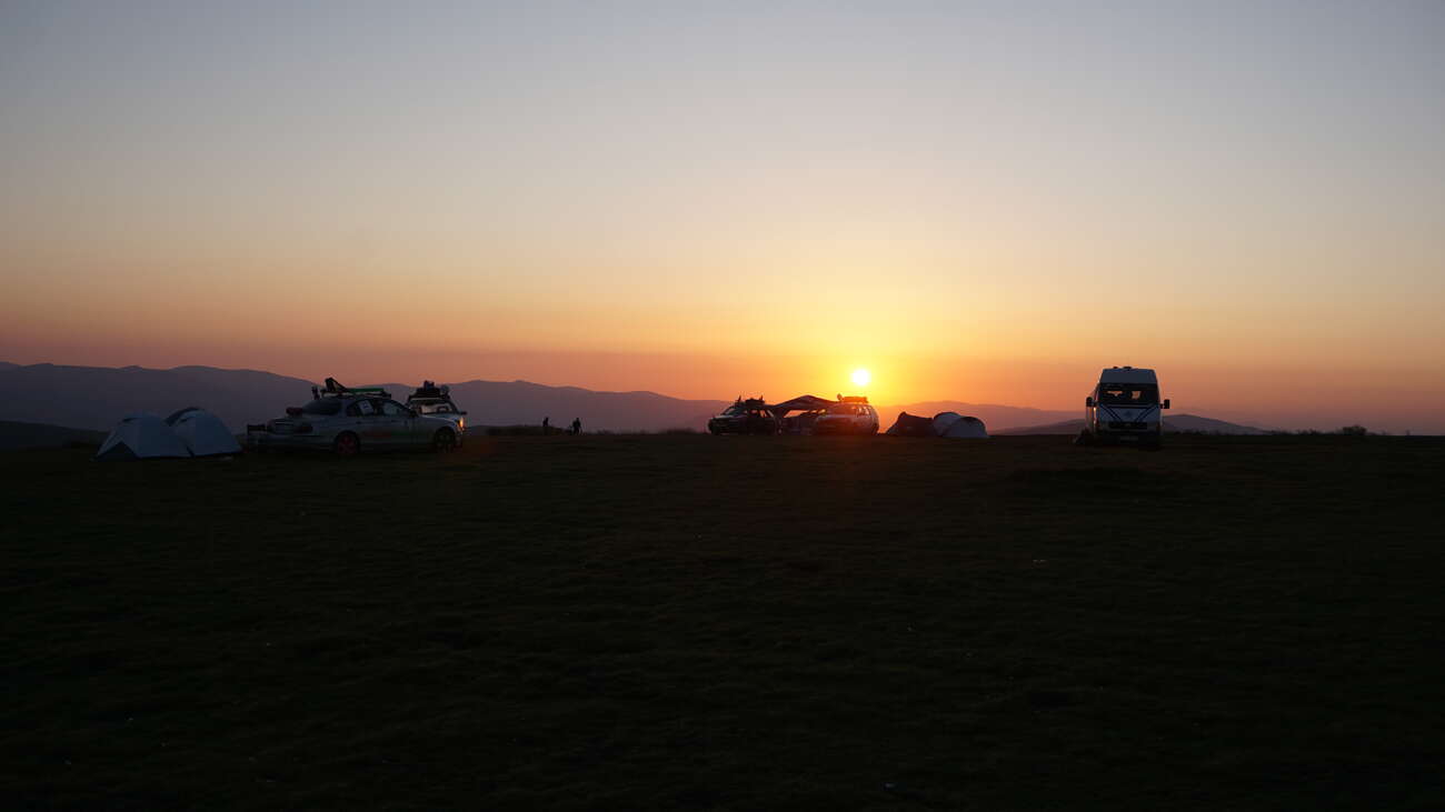 Bylo brzké ráno, ještě před svítáním, tak jsem se vydal kousek k silnici a vyhlížel východ slunce. Je to opravdu parádní, takhle na horách. Mám jej ještě radši než u moře. Fotky byly úchvatné. Představení po nějaké chvíli skončilo a chtěl jsem si ještě lehnout do spacáku. V tom rachot, já se leknul co to je. Jedna fenka z těch dvou se rozhodla přiběhnout ke mně. Přiběhla s dusotem, jak je velká, lehla vedle mě, packy nahoru a chtěla škrábat, hrát si. Byla moc hodná, vzbudila i další členy posádky a strávila s námi snídani.