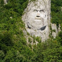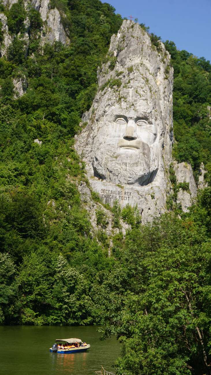 Další bod byla brána polibků v městě Targu Jui. Zastávku jsme využili k rychlému obědu, fotce brány, ne opravdu jsme se u ní vzájemně nelíbali a už valíme dál. Čas nás skutečně tlačí. Mění se řidič, nastupuje na dojezd do cíle Kryštof, což se na něm následně podepsalo. Blížíme se k Dunaji a je hyc, no jak v létě. Kvůli času vypouštím kontrolní bod Herculovy lázně a volím rychlejší trasu do cíle. Lázně až zítra. I toto nám osud daroval správně a mělo to tak být, však se dočtete dál. Dojíždíme k Dunaji, v místě, kdy teče mezi kopci a tvoří hranici se Srbskem. Místo se jmenuje Železná Vrata. Železná vrata je název pro nejmohutnější průlomové údolí v Evropě. Řeka Dunaj zde prořezává masiv Banátských Karpat a převádí své vody z Panonské do Valašské nížiny. Nádherné místo a je zde i poslední kontrolní bod skála v níž je vytesán obličej Decabuluse, někteří jej nazývají největším Rumunem historie. Hledí varovně přes řeku do Srbska.