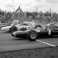 V rychlosti kolem 270 km/h ztrácejí pneumatiky Stewartova monopostu BRM poslední dotyky s povrchem trati a kloužou na vodní vrstvě.