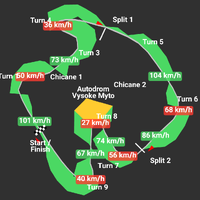 Plný, držím se vlevo, redline, za tři, stále pod plným co nejvíce narovnávám pravotočivou přes obrubník a hledám brzdný bod. Dupnu na brzdu až mám levé kolo na začátku obrubníku, pohled na vrchol, pustím brzdu a setinu počkám až se auto stabilizuje, pravou co nejvíc narovnám přes obrubník. Na výjezdu hezky dávkuju plyn a s radostí opírám o levou krajnici a plný - stále za tři. Split 2.