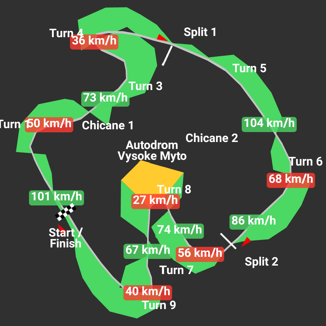 22. 3. 2018, 17:05Kdyz to dam vedle sebe, tak ty muzes pritlacit v zatackach 4 a 7, a ja bych mel pritlacit v 6 a 8.
